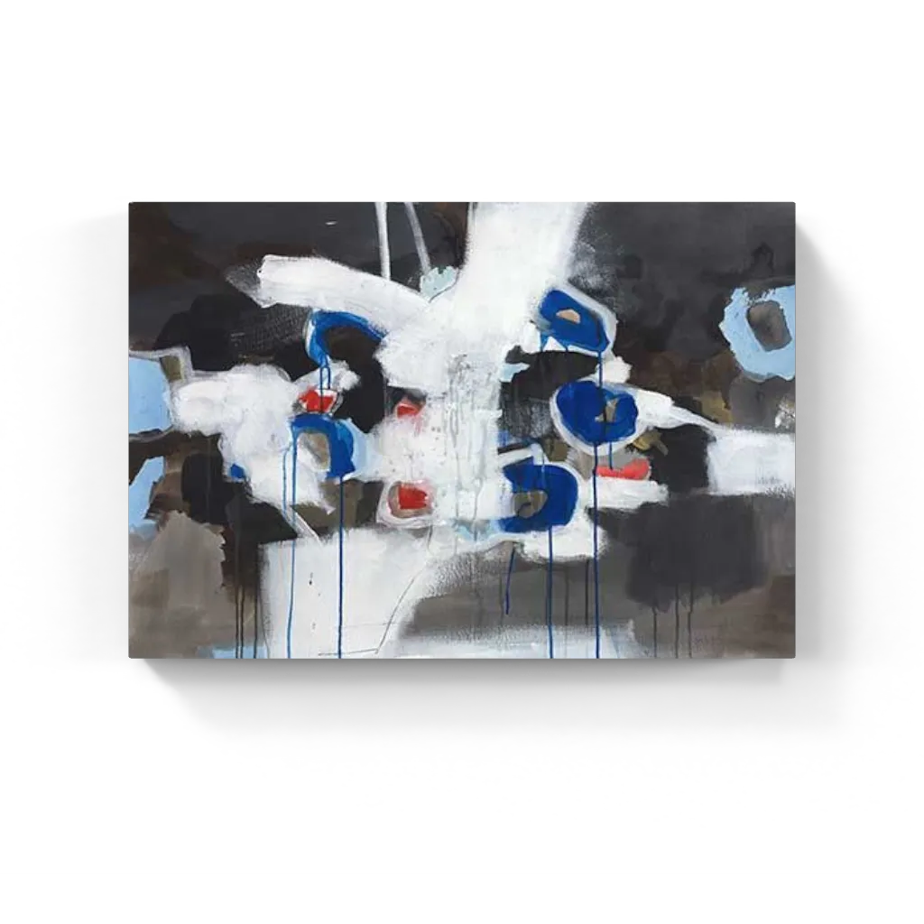 Bold blue orbs drip against a haze of white and brown abstraction—like fragments of thought or memory suspended mid-motion. Energetic, layered, and emotionally raw.