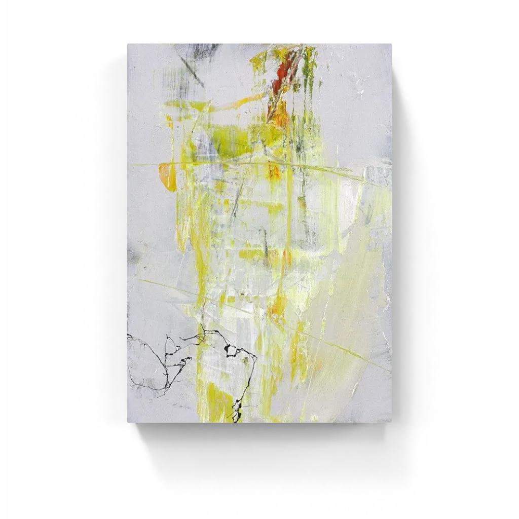 A burst of citrus yellow slashes through a pale, chalky field—loose, raw, and unfiltered. Delicate black scribbles balance the energy with a hint of intention in the chaos.