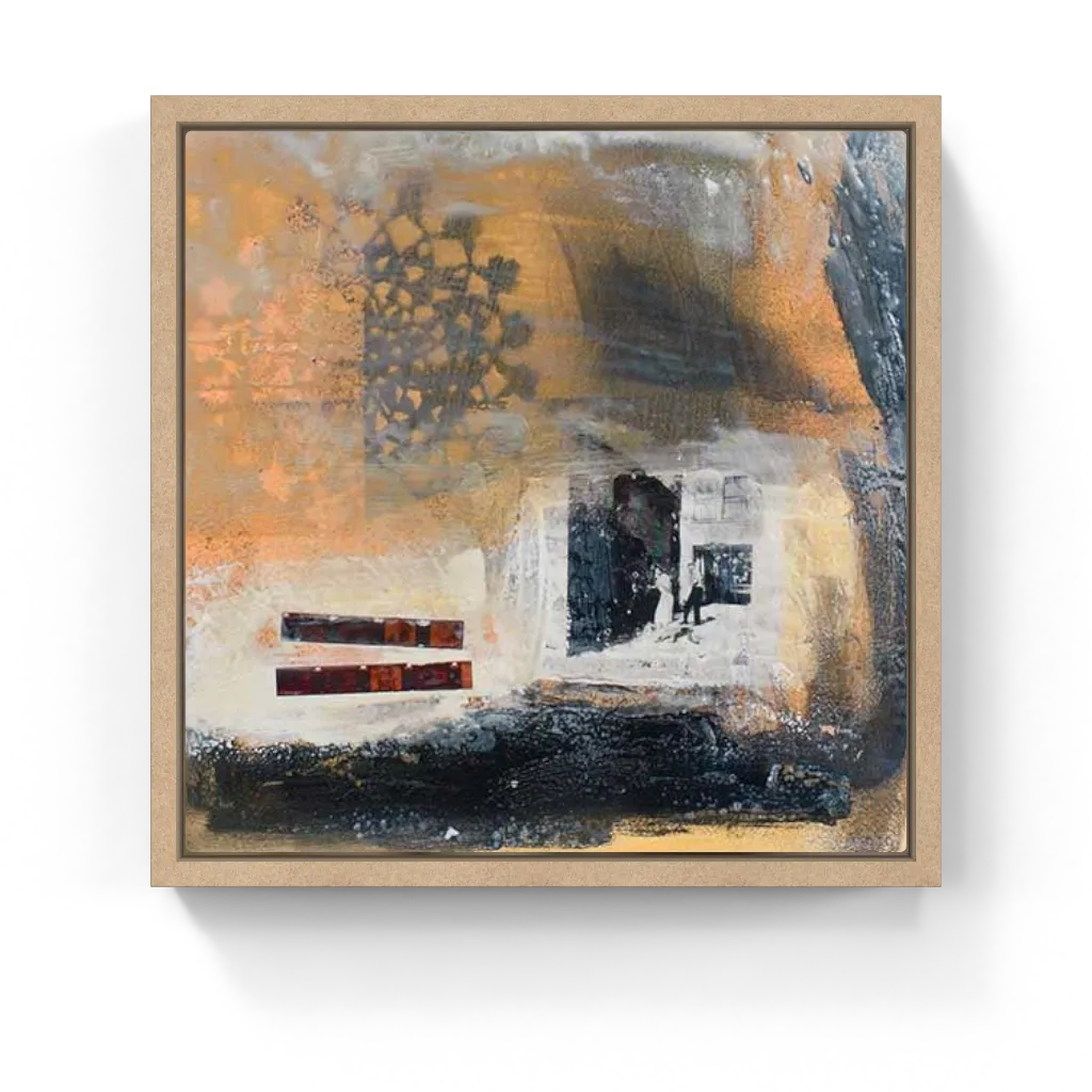 Layered and evocative, this mixed media abstract fuses warm ochres, textured blacks, and fragmented forms. It evokes memory, architecture, and time. Rich in depth and texture, it captures a mysterious, tactile atmosphere ideal for modern interiors.