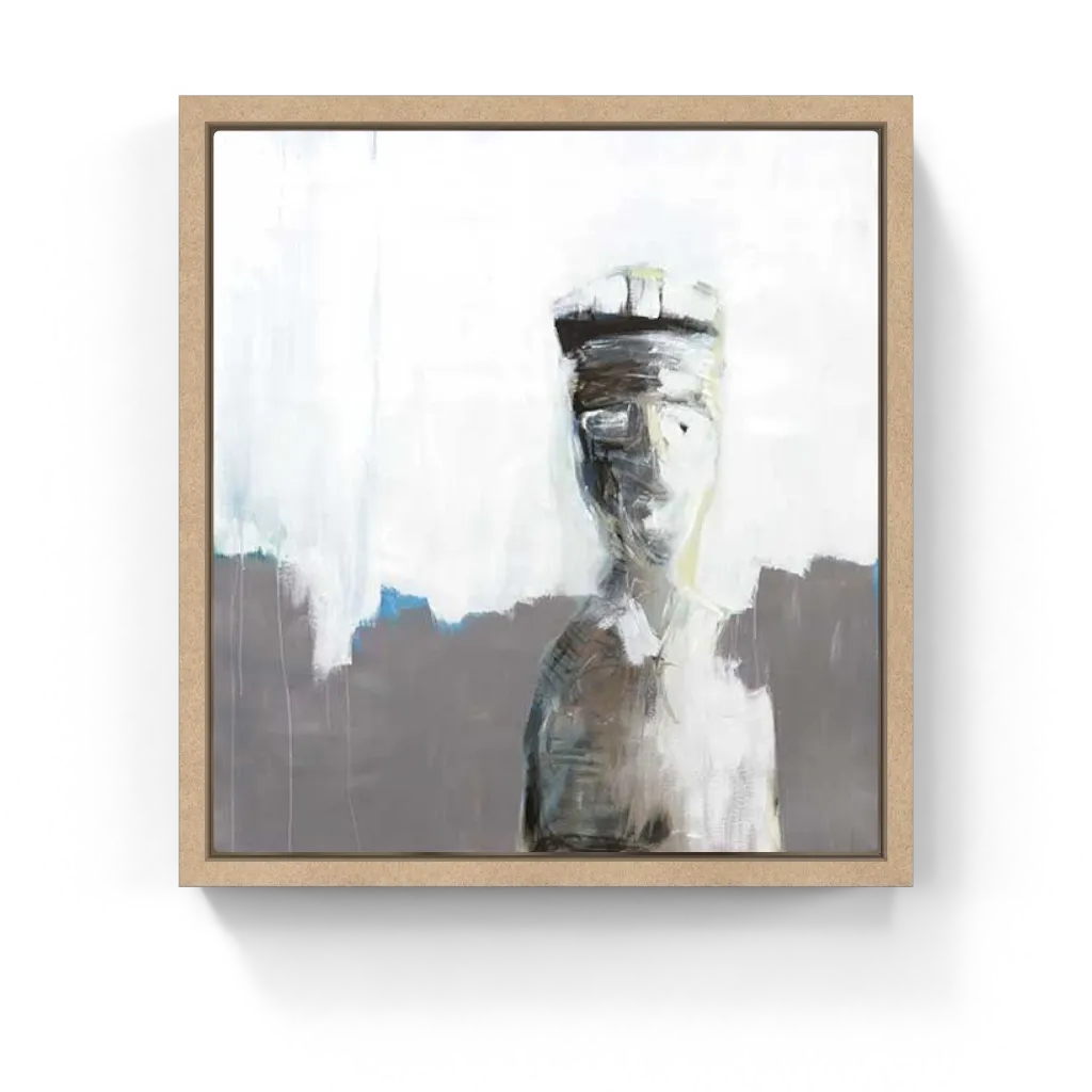 A solitary figure emerges from shadows—half-formed, half-erased—bathed in moody grays, earthy browns, and spectral whites. The presence feels fragile and unresolved, turning identity into a quiet question. This moody figurative abstract balances emotion, atmosphere, and modern restraint.