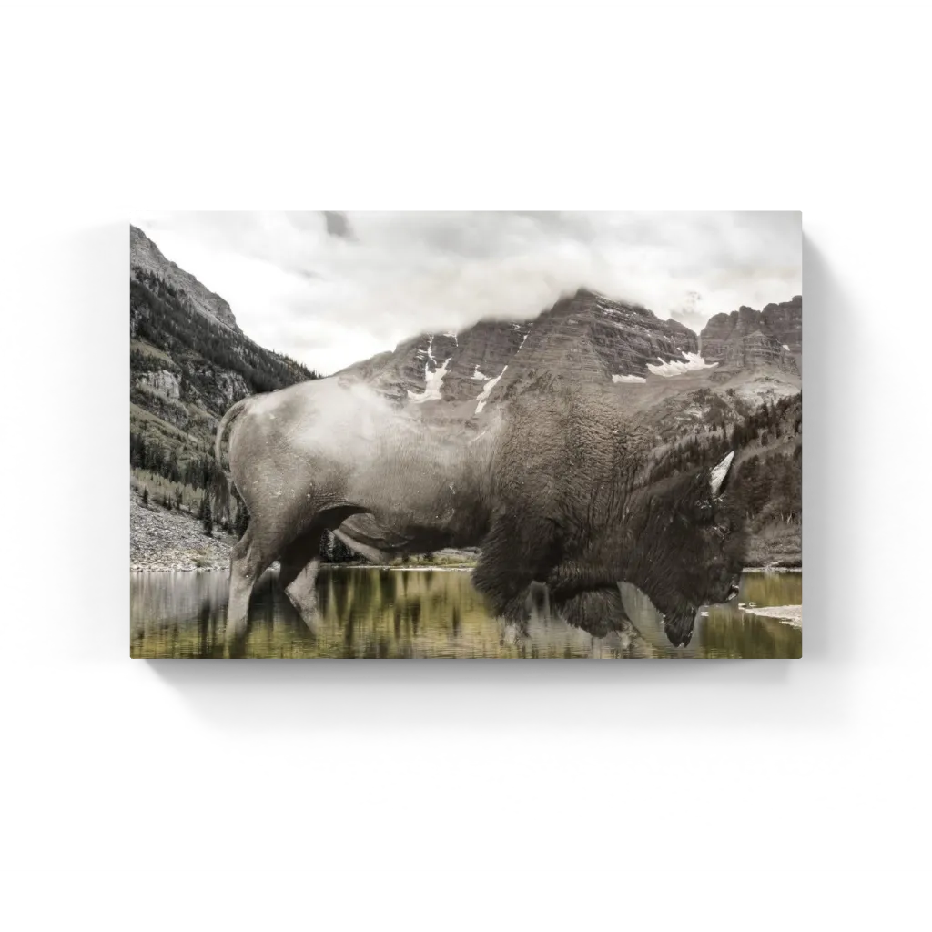 This surreal bison and mountain landscape artwork merges wildlife and scenery into a single dreamlike vision. A majestic bison flows seamlessly into mist covered peaks and serene reflective waters. It creates an image that captures the raw beauty and mystery of nature. Perfect for contemporary interiors seeking a striking, nature inspired statement.