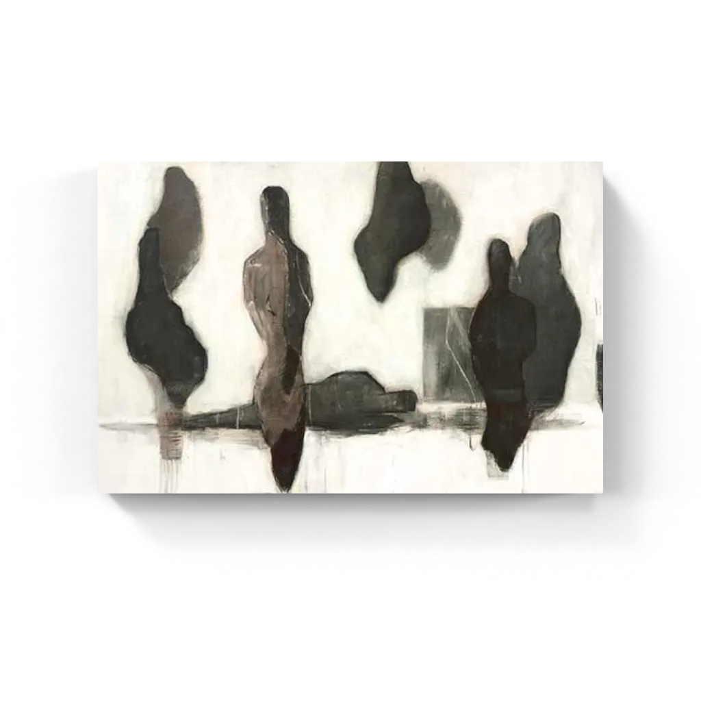Abstract silhouettes gather and drift in a pale, undefined space—tall forms evoking presence, memory, and silent conversation. This abstract monochrome silhouettes piece carries a quiet emotional weight, using minimal shapes and soft contrast to create a sense of openness, stillness, and subtle connection.