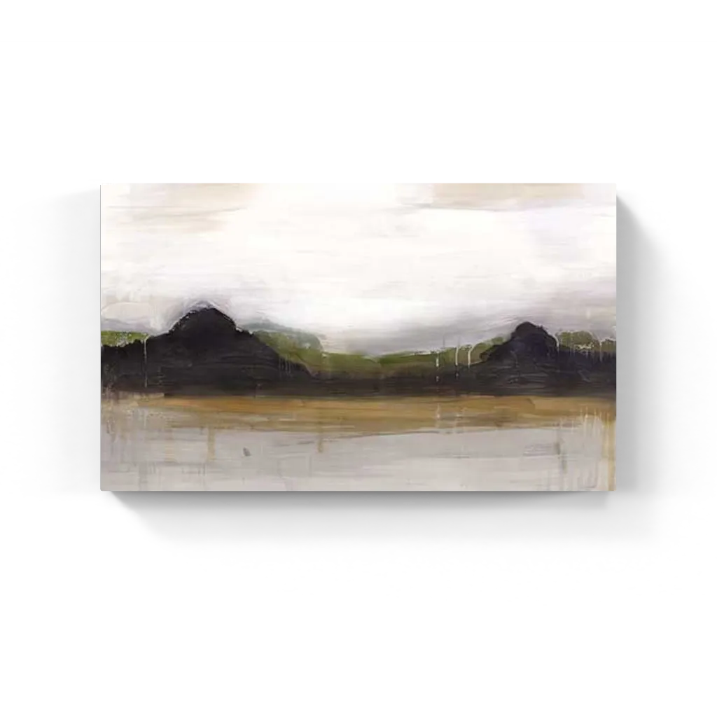 Abstract landscape painting capturing a minimalistic horizon, featuring mountains melting into earthy tones and soft, dripping textures. Subdued colors evoke a serene, reflective mood.