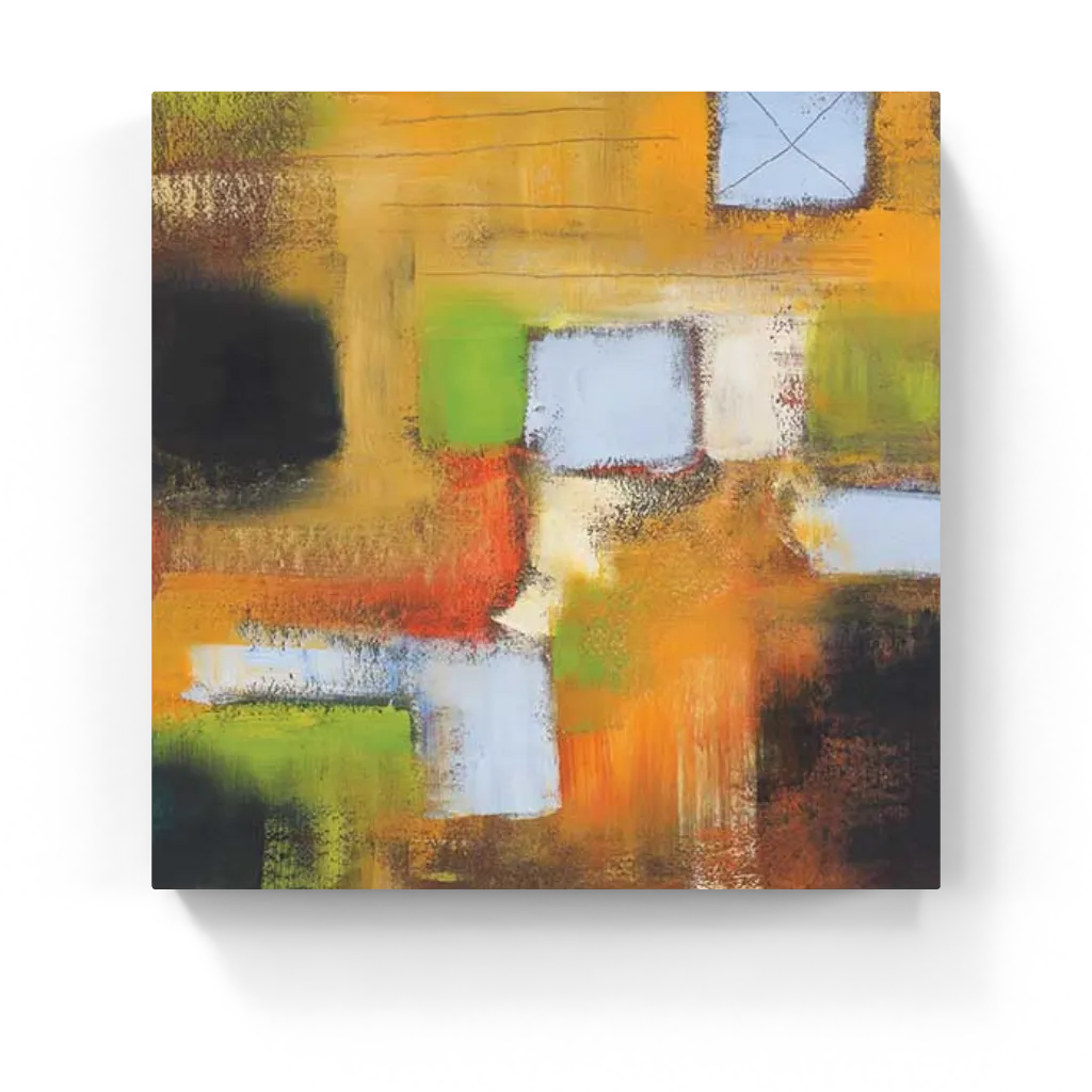 A vibrant collision of burnt orange, pale blue, and acid green defines this colorful abstract painting. Bold blocks of pigment meet smoky textures and gestural marks, layering movement with depth. Lively and expressive, it pulses with visual rhythm, creating a contemporary composition that feels both dynamic and balanced.