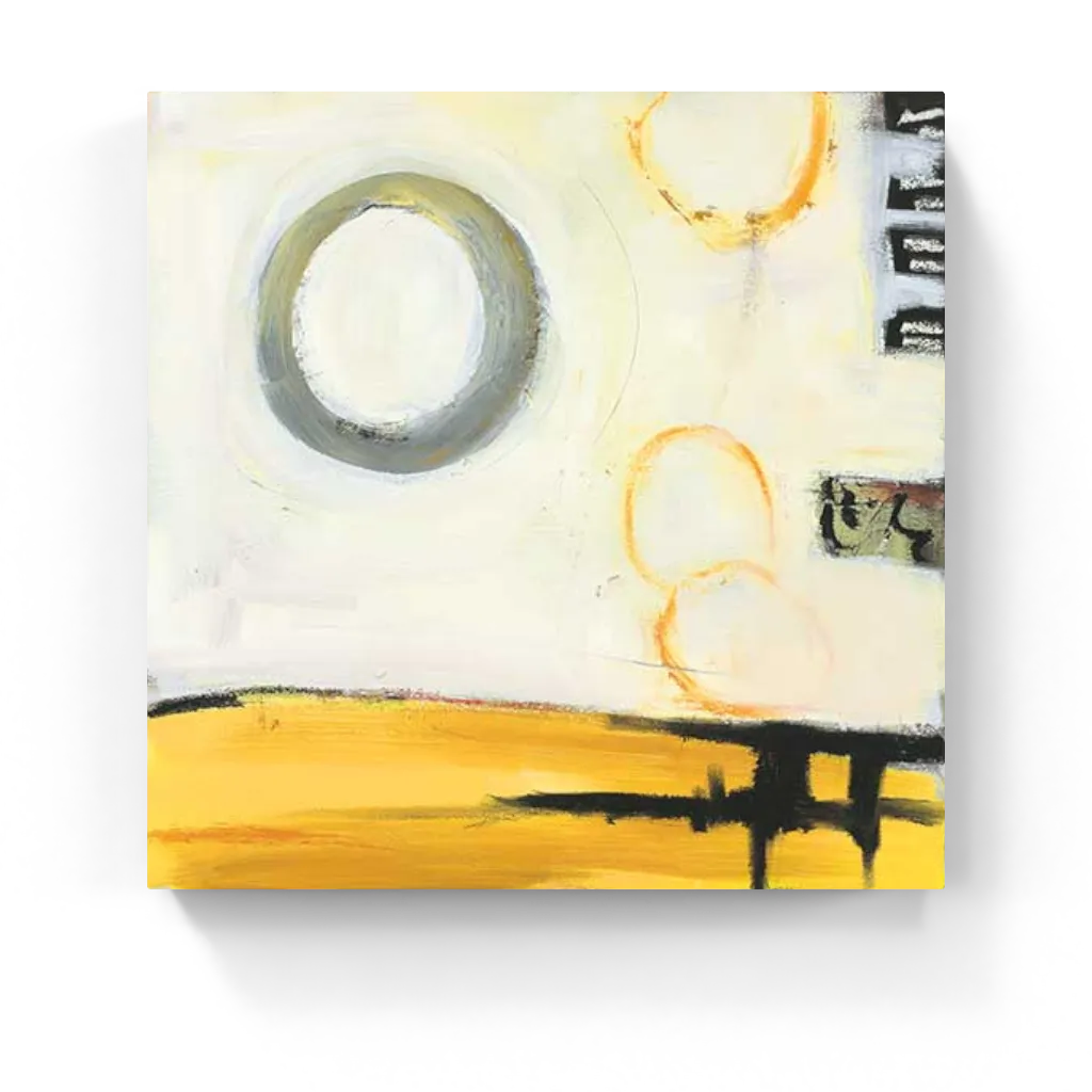 Lively and luminous—this modern abstract blends soft whites with golden yellow, charcoal accents, and expressive circular forms, creating a sense of rhythm and spacious energy.