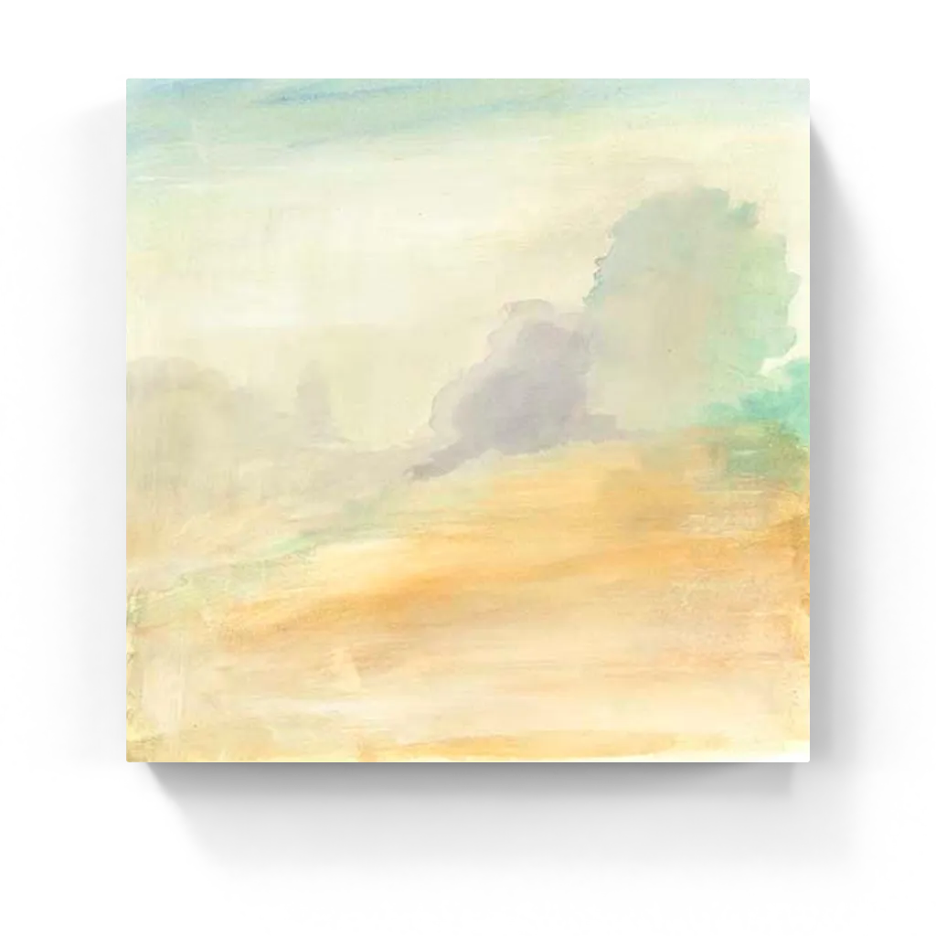 Soft watercolor painting featuring marsh meadows in delicate shades of beige, gold, pale green, and muted blue, creating a soothing, abstract landscape.