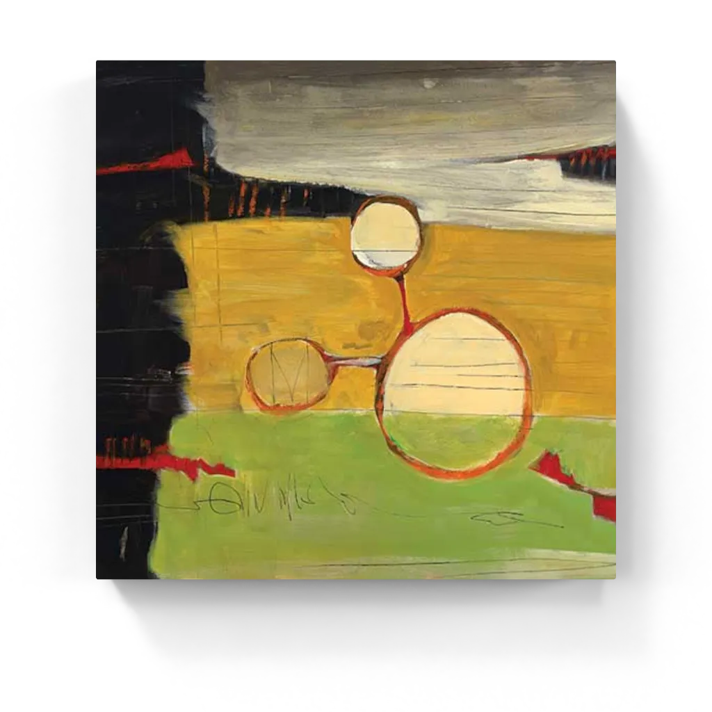 Bold and playful, this abstract landscape layers fields of ochre, green, and charcoal with three outlined circular forms—suggesting figures, maps, or cosmic symbols in a surreal terrain.