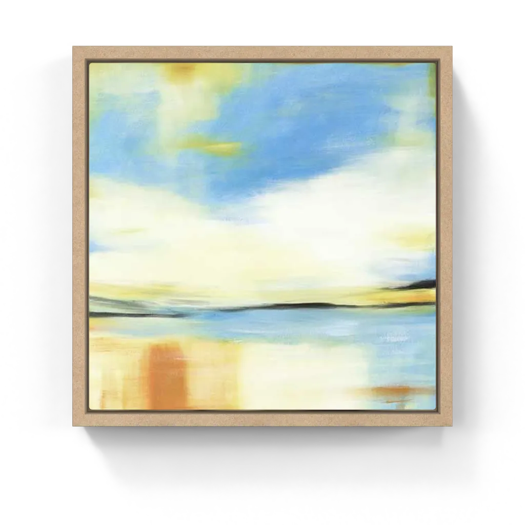 Awaken to tranquility with this contemporary abstract landscape painting, featuring luminous shades of lemon yellow, soft blues, and gentle oranges. Its soothing colors and serene composition evoke peaceful mornings.