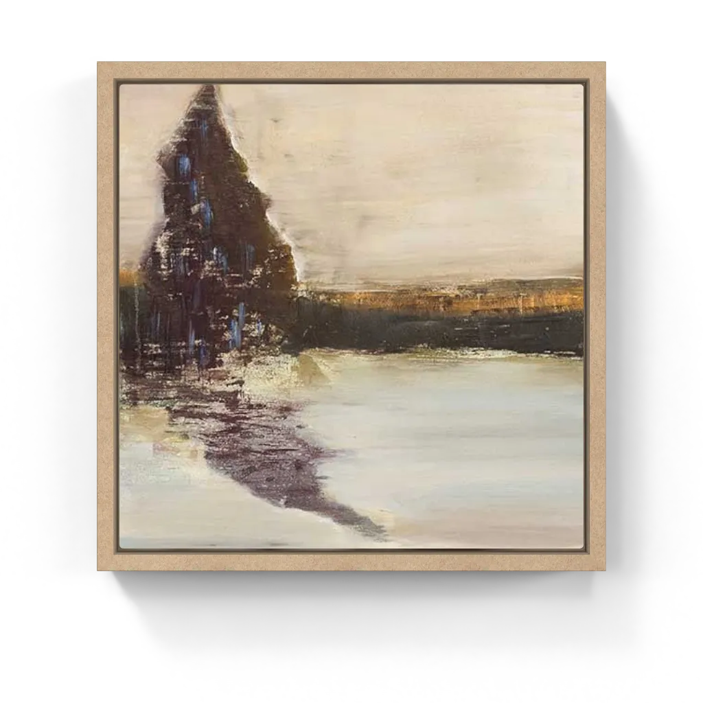 Abstract landscape painting featuring muted earth tones, soft textures, and reflective water, evoking a serene and introspective mood.