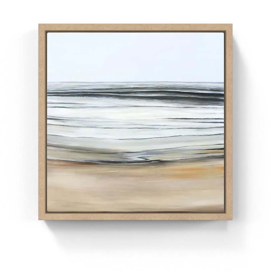 Soft, flowing lines of muted beige, gray, and white stretch across this abstract coastal scene. The smooth transitions between colors evoke the peaceful rhythm of the sea, creating a serene and timeless seascape.