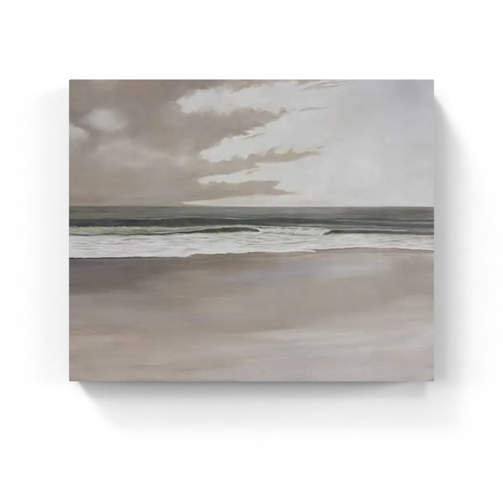 Serene coastal painting featuring a tranquil seascape with gentle waves, sandy shores, and soft, moody clouds, evoking a peaceful, contemplative atmosphere.