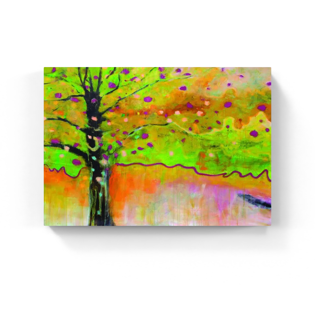 A neon dream of nature—this electric tree bursts through a blaze of lime green, orange, and violet. Abstract expression meets wild whimsy in this vividly textured landscape.