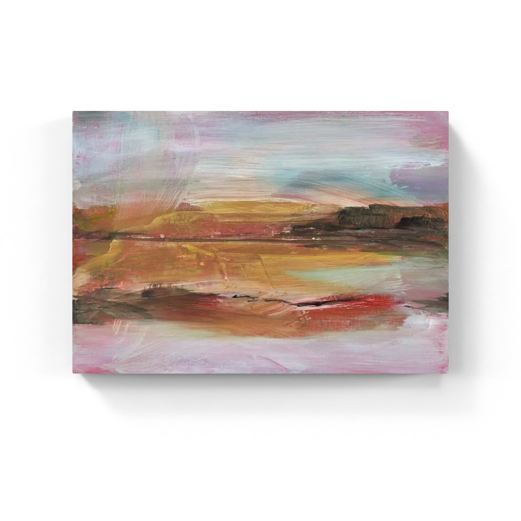 Abstract landscape painting characterized by expressive brushstrokes in shades of muted blues, warm earth tones, and soft pinks, suggesting a serene horizon and reflective waters with an impressionistic sense of light and space.