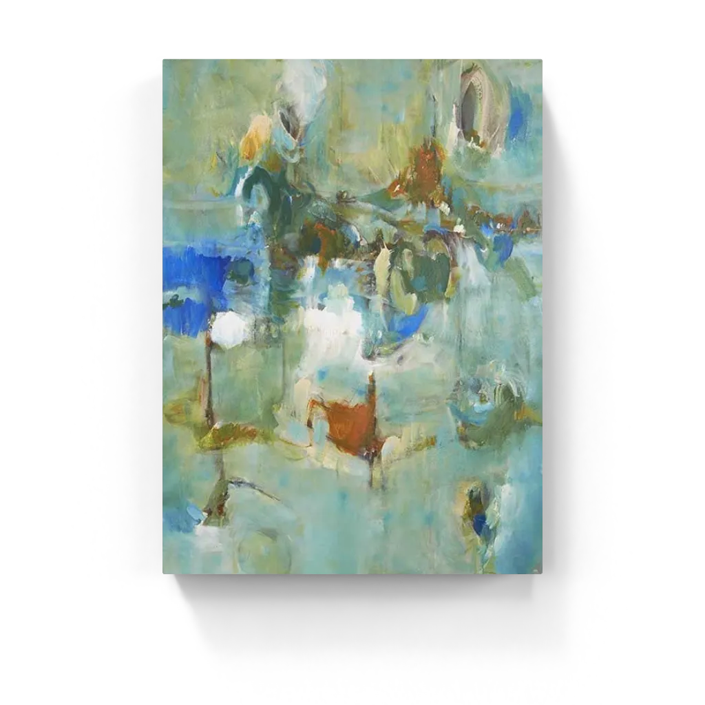 A sea of soft aquas, deep blues, and earthy rusts ripple across the canvas in this lyrical abstraction—suggesting glimpses of landscape, water, and memory filtered through motion and emotion.