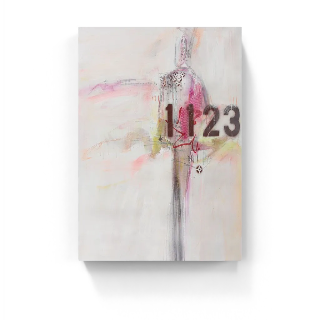 This abstract mixed media art piece combines dreamy textures with data inspired symbolism. A human like figure hides in a haze while the numbers “1123” loom like a cryptic code. Pastel smears collide with gritty surfaces, creating tension between softness and structure. Layered and expressive, it’s a striking artwork for collectors drawn to concept pieces with texture.