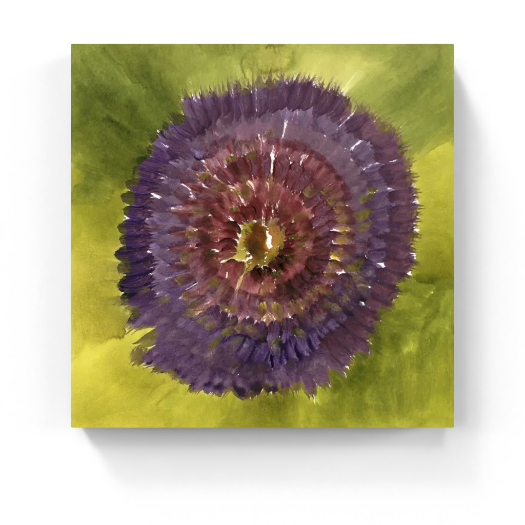 Deep plum and maroon petals spiral inward toward a luminous gold center, blooming against a mossy green field. This abstract floral feels earthy and electric—like a flower pulsing in twilight.