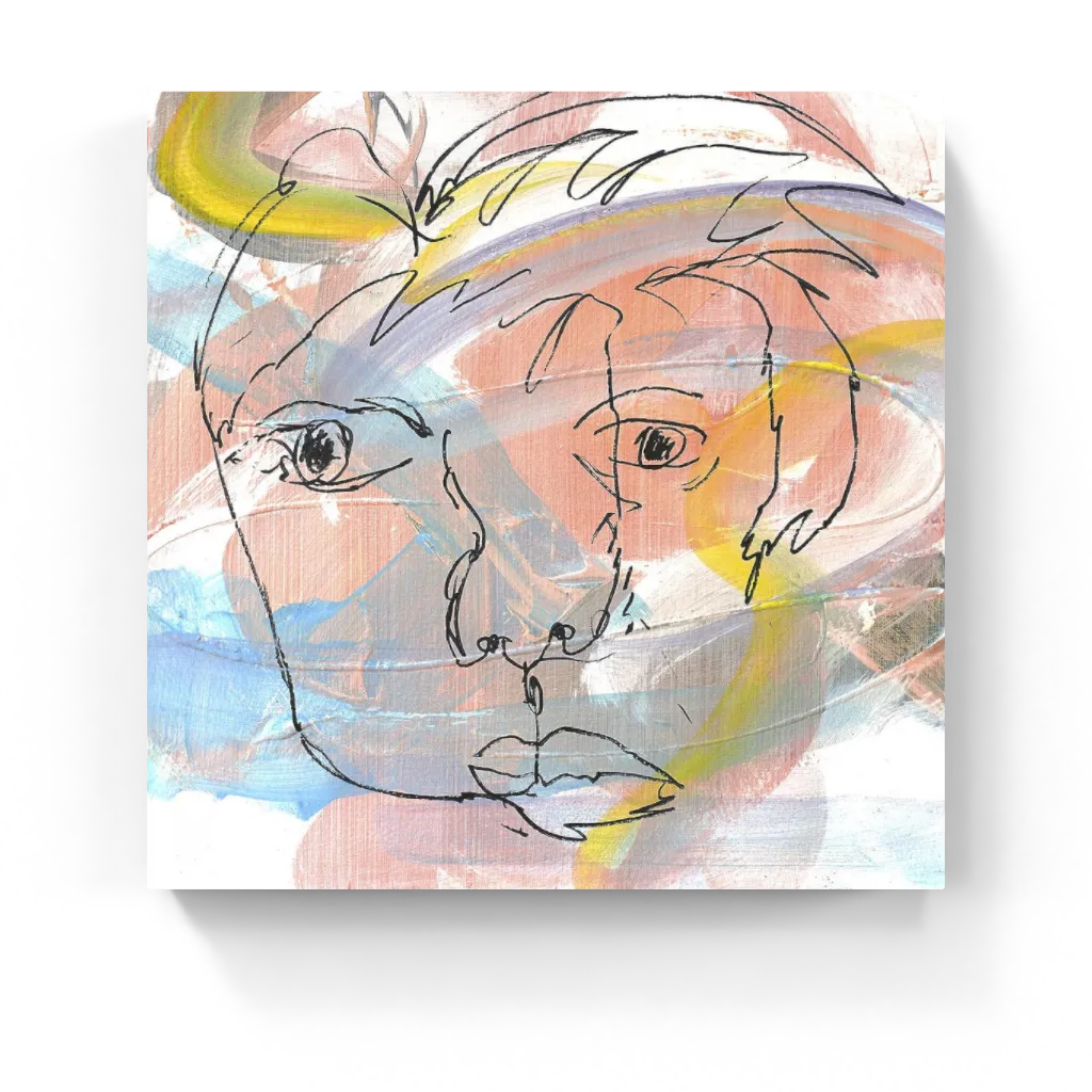 “In Thought I” playfully merges emotion and abstraction—a loose, expressive line drawing of a face floats over swirling pastel brushstrokes, blending introspection with vibrant spontaneity.