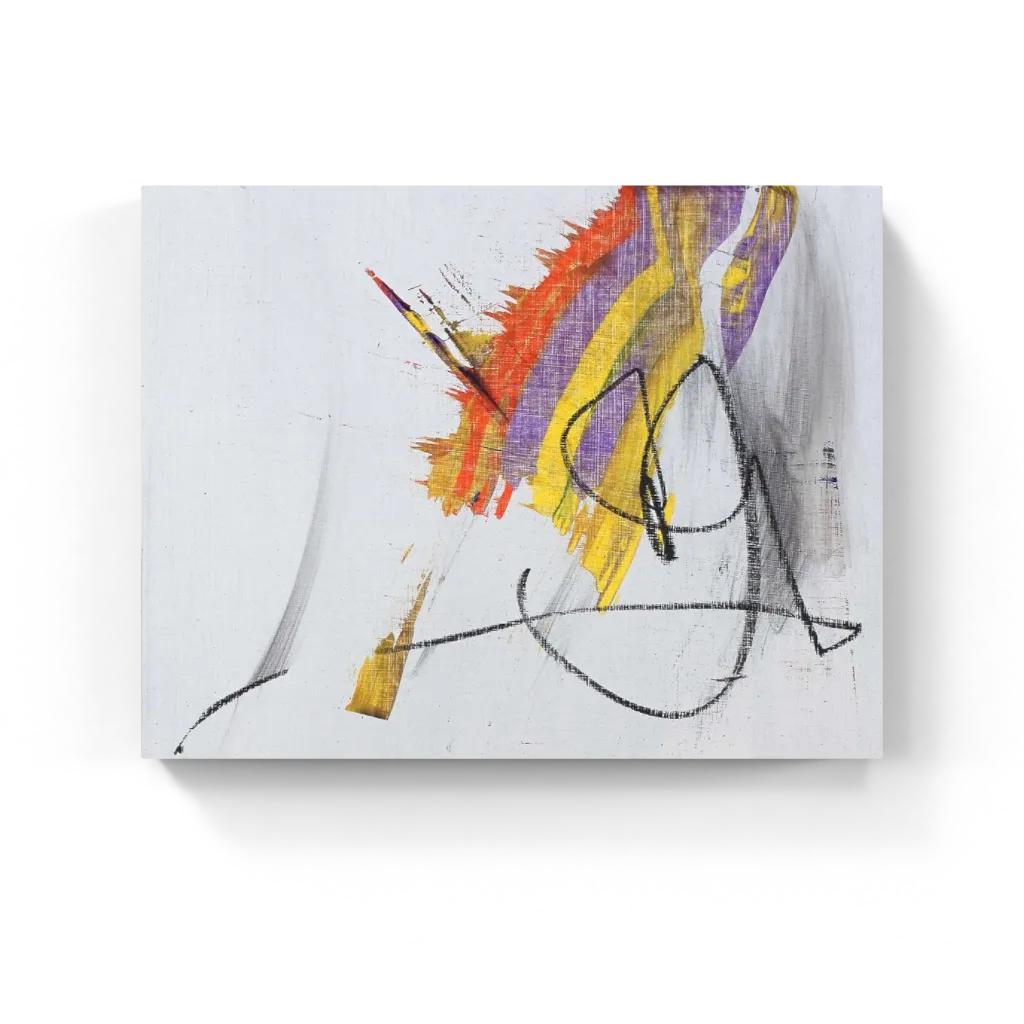 Vibrant streaks of orange, yellow, and violet clash and cascade over raw canvas, tangled in urgent black scribbles. This abstract composition crackles with motion—bold, imperfect, and unapologetically alive.