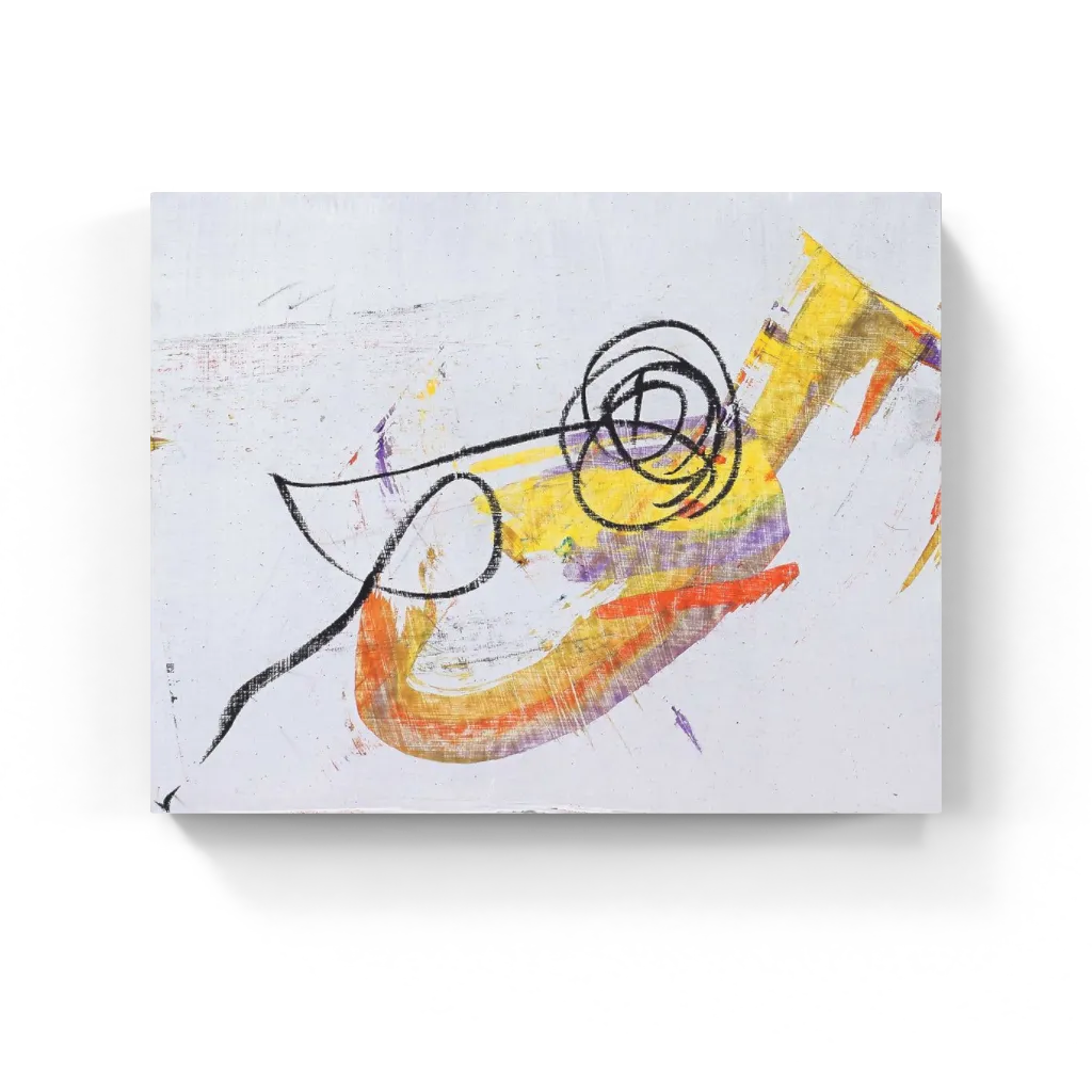 Vibrant streaks of orange, yellow, and violet clash and cascade over raw canvas, tangled in urgent black scribbles. This abstract composition crackles with motion—bold, imperfect, and unapologetically alive.