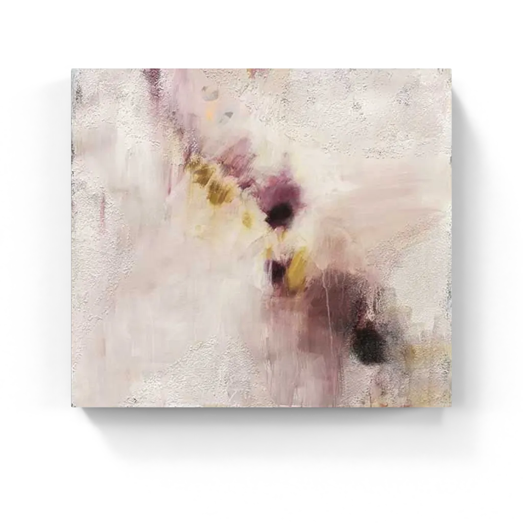 Soft mauves and golden ochres blend with rich violet and deep shadow in this textured abstract—suggesting floral forms or fading memories, it hums with quiet depth and ethereal motion.