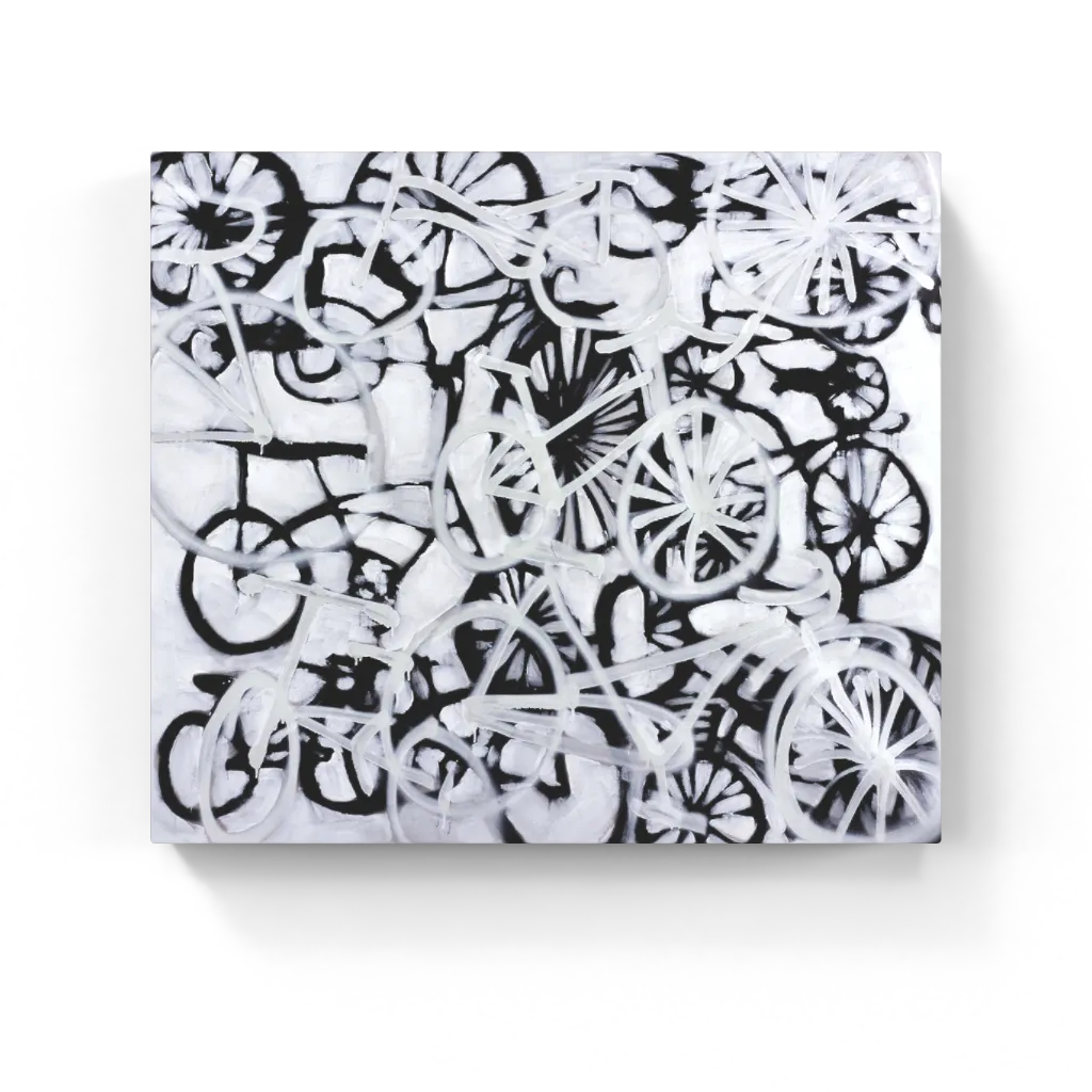 A dense tangle of wheels and frames spins into a monochrome cyclone of motion. This bicycle abstract painting layers black and white forms like shadows and memories colliding in constant movement. Dynamic and expressive, it captures rhythm, speed, and the poetry of motion into abstraction.