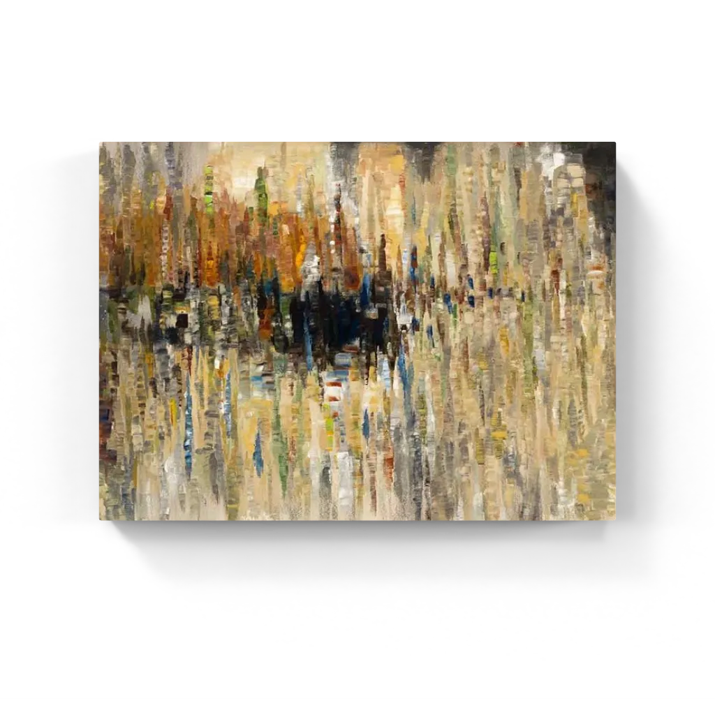 Chroma Wave II ripples with tonal depth, cascading vertical strokes of earthy neutrals, cool blues, and golden hues into an elegant reflection. Its layered composition feels both organic and orchestral, balancing natural rhythm with artistic structure. Rich in texture and movement, this contemporary piece makes a sophisticated statement for interiors seeking color, harmony, and depth.