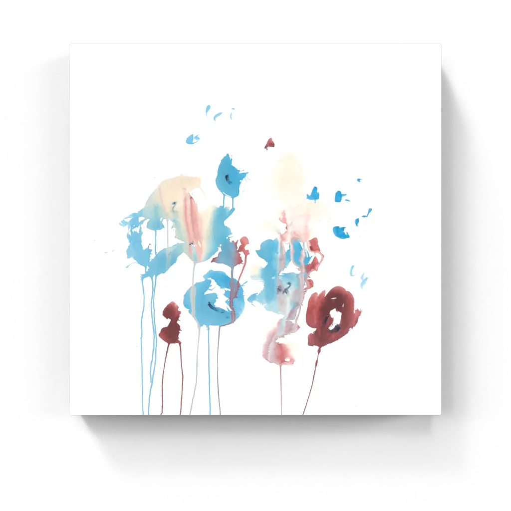 Delicate streaks of blue, crimson, and blush drip downward, forming petal-like stains suspended in white space. This delicate watercolor painting captures fragility and movement—like a quiet garden breathing in color and light.