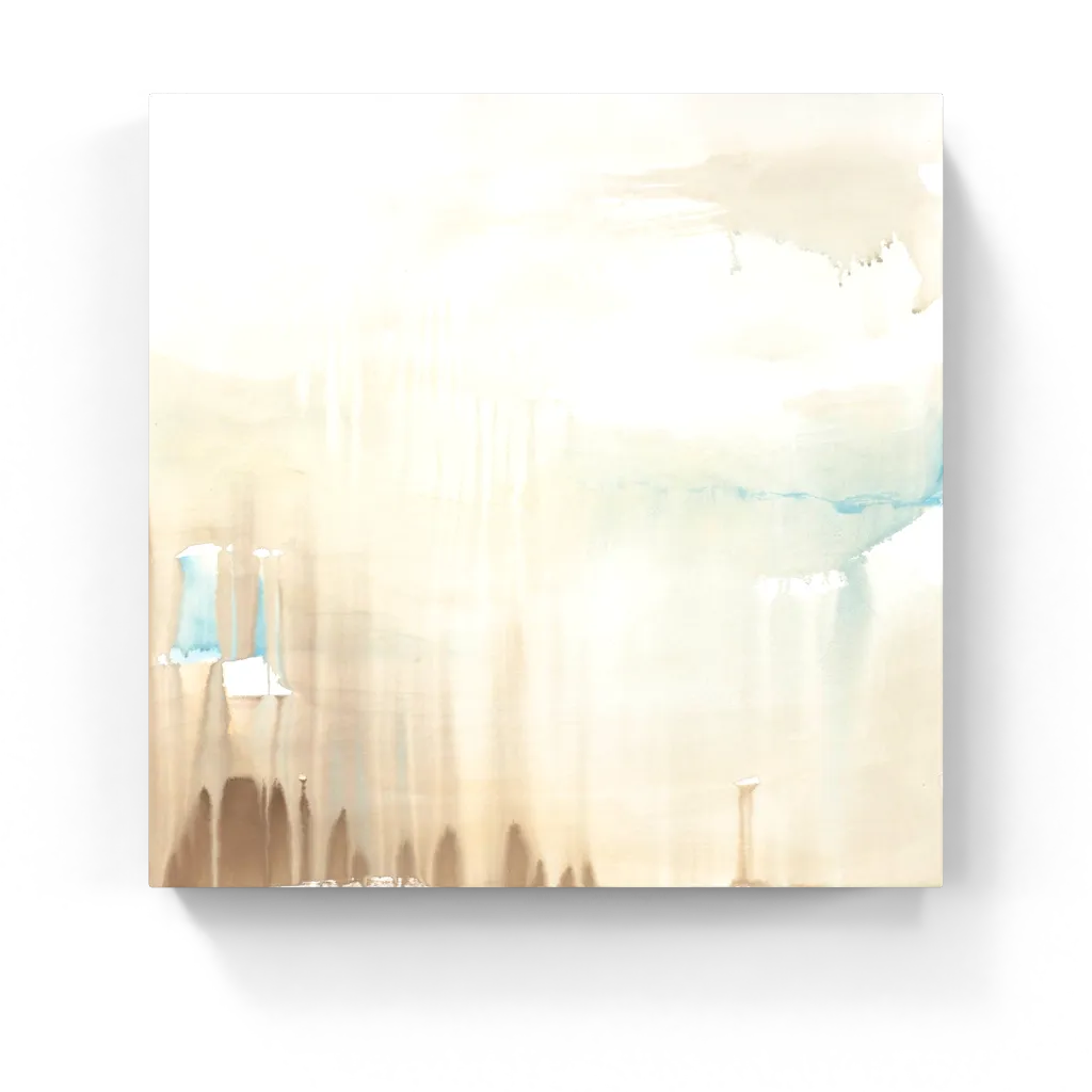 This ethereal abstract watercolor blends soft washes of cream, sand, and pale blue that drift downward in gentle drips. Fog-like layers melt into one another, creating a sense of quiet erosion and spacious calm. Subtle, atmospheric, and minimalist, this artwork brings a serene, meditative presence to any interior.