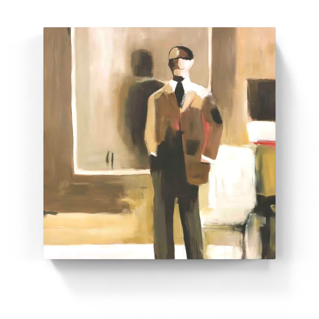 A faceless figure in formalwear stands poised in a hazy, sepia-toned interior, casting a soft-edged shadow. Elegance is blurred here—style distilled into gesture, memory, and muted form.