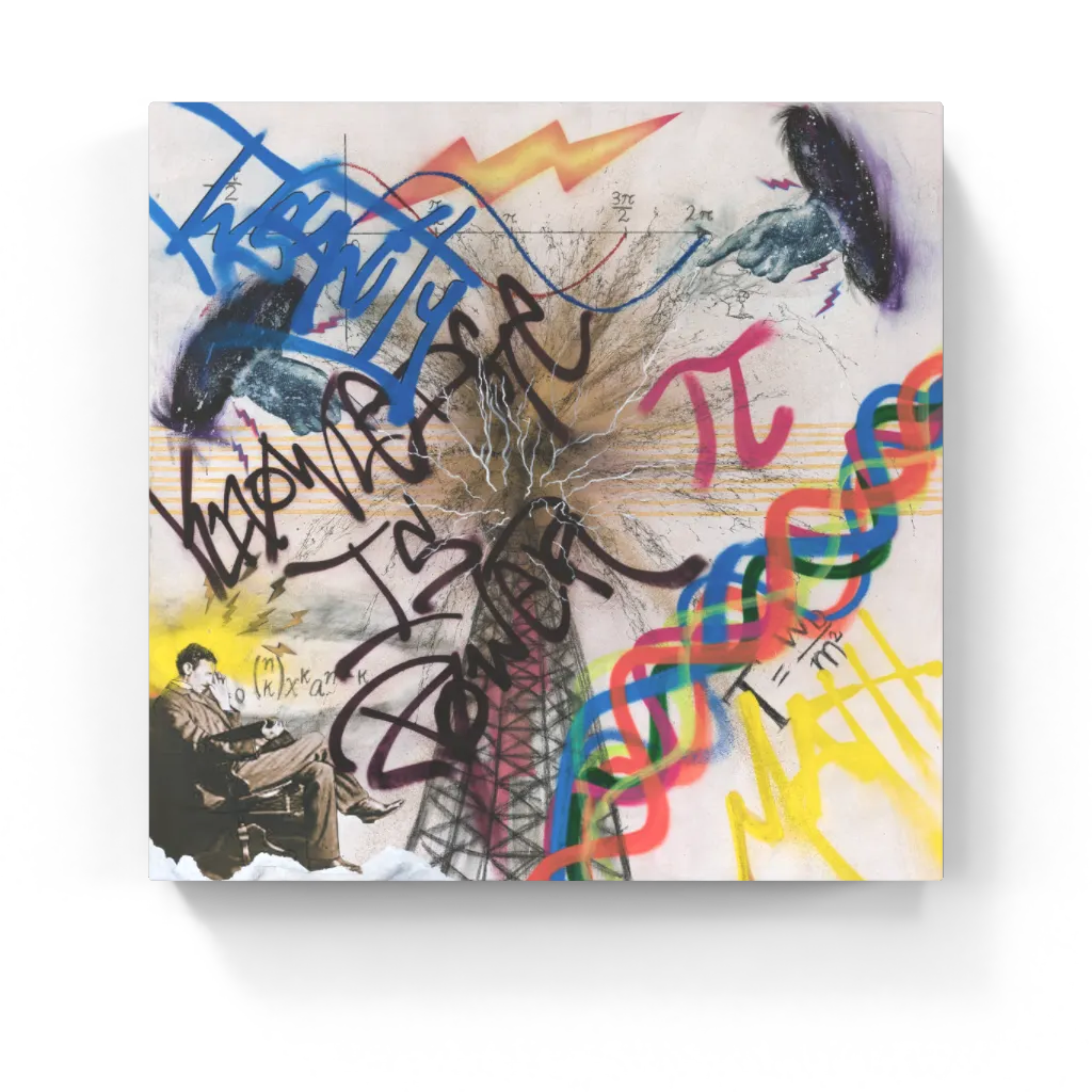 Knowledgable Daydreaming explodes with a fusion of science, street art, and symbolism—Tesla, math, lightning, and layered graffiti converge in a brain-burst of curiosity and chaos. It’s knowledge as kinetic force, theory with a spray can.
