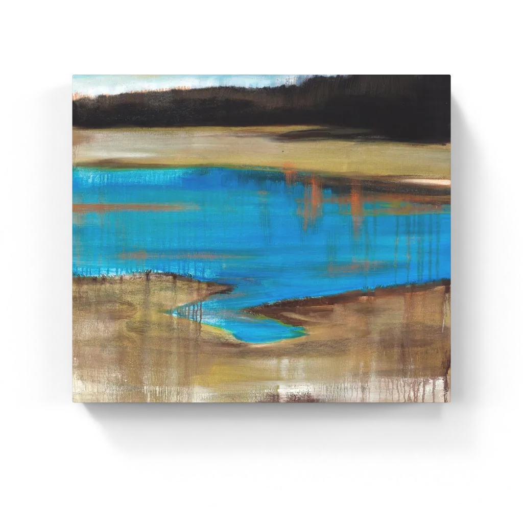 A vivid blue lagoon carves through earthy terrain, its edges melting into hazy greens and deep forest shadows. Vertical drips echo rain or memory—an abstracted landscape in motion.