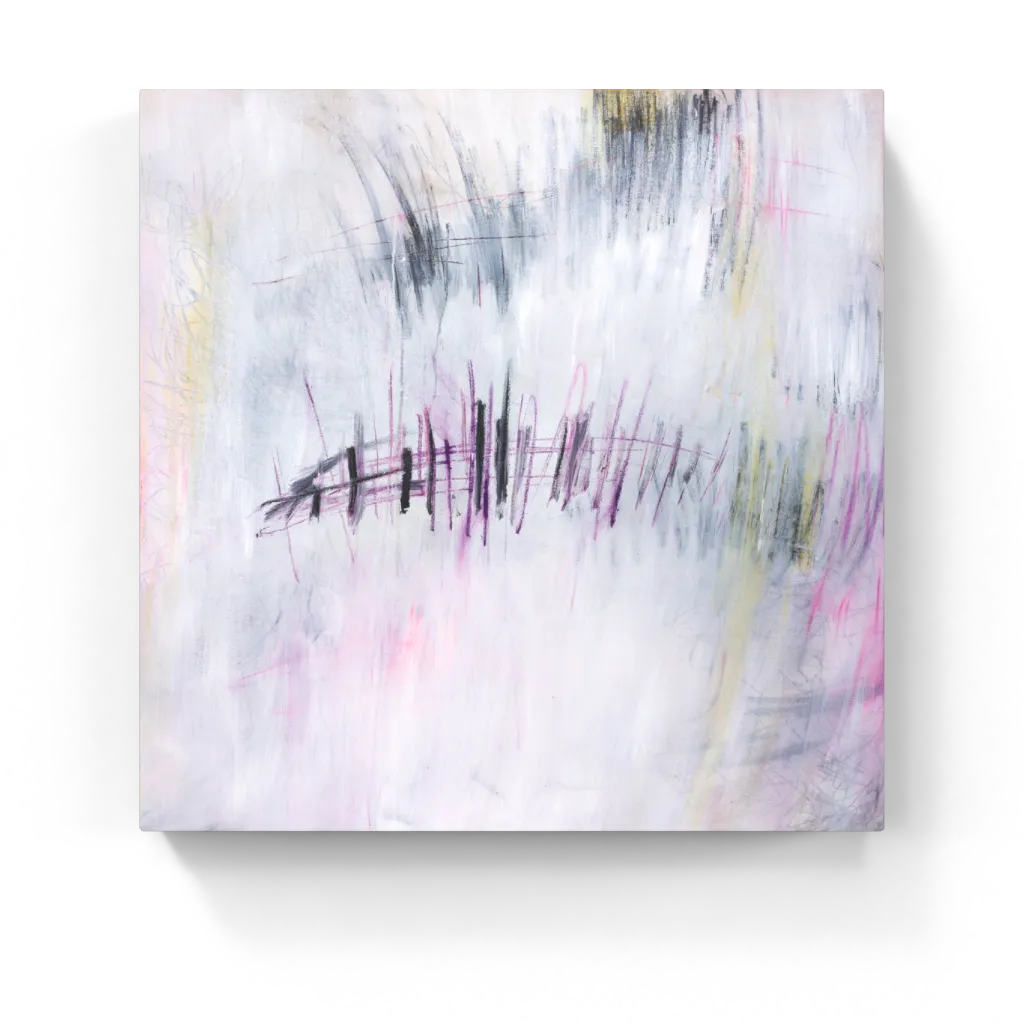 Scratchy lines and vertical streaks cut through a hazy field of lavender, blush, and smoky white. This abstract painting hums with subtle tension, layering gesture, texture, and quiet chaos.