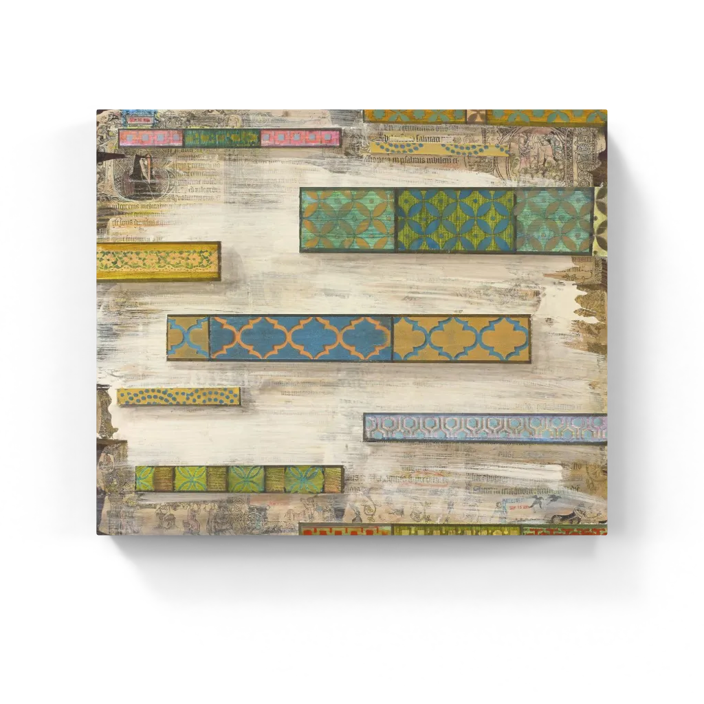 A contemporary piece featuring various patterns against a mixed media background. This piece has a mate, Medieval Modern II.