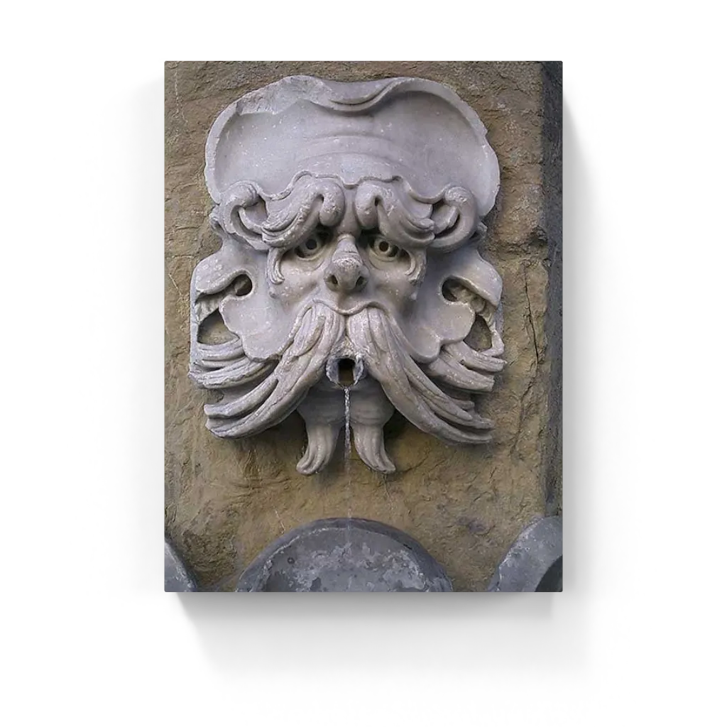 A whimsical stone fountain juts from a corner wall, featuring a bearded, mustachioed face and ornate Baroque curls—classic Europe with a touch of flair.