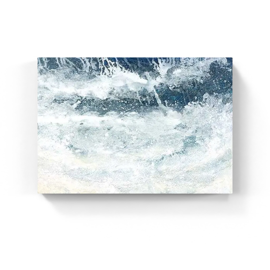 Waves of icy blue and foamy white crash and swirl in this textured abstract. Energetic yet serene, it captures the motion and mystery of water in flux.