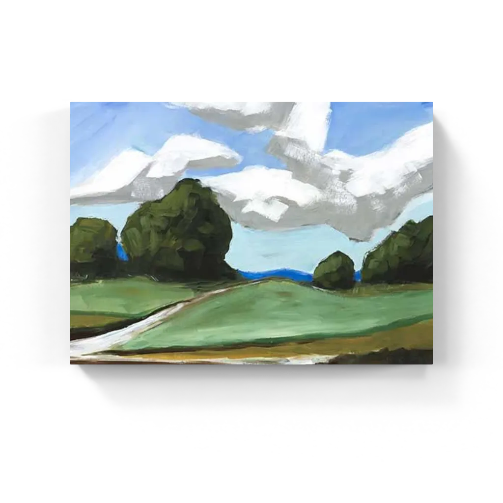 Permanent Voyage I captures a stylized journey through open land—bold brushstrokes shape rolling green hills, abstract trees, and sweeping clouds beneath a bright blue sky. Graphic, fresh, and full of motion.