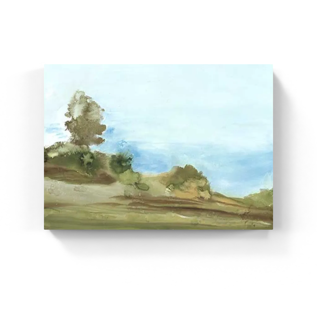 Prominence I captures a soft, open landscape—muted greens and browns shape gentle hills beneath a wide, pale blue sky. Watercolor textures lend a dreamy, serene atmosphere.