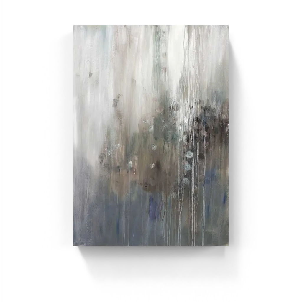 Soft drips and earthy hues flow through misty whites and steely blues—this abstract evokes quiet renewal, where decay meets delicate bloom.