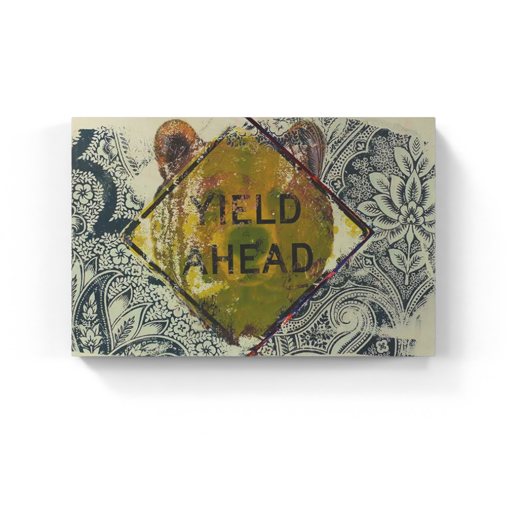 A warning sign reads “YIELD AHEAD,” but lurking behind it is the ghostly face of a bear—part threat, part guardian. Surrounded by ornate black floral wallpaper, this piece fuses danger and decoration into a surreal roadside relic.