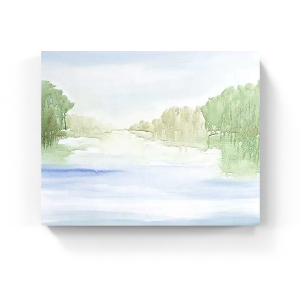 A peaceful watercolor landscape of a quiet river or stream surrounded by lush trees. Soft blue and green tones evoke a calm, reflective atmosphere, making it ideal for those seeking tranquility in their home decor.
