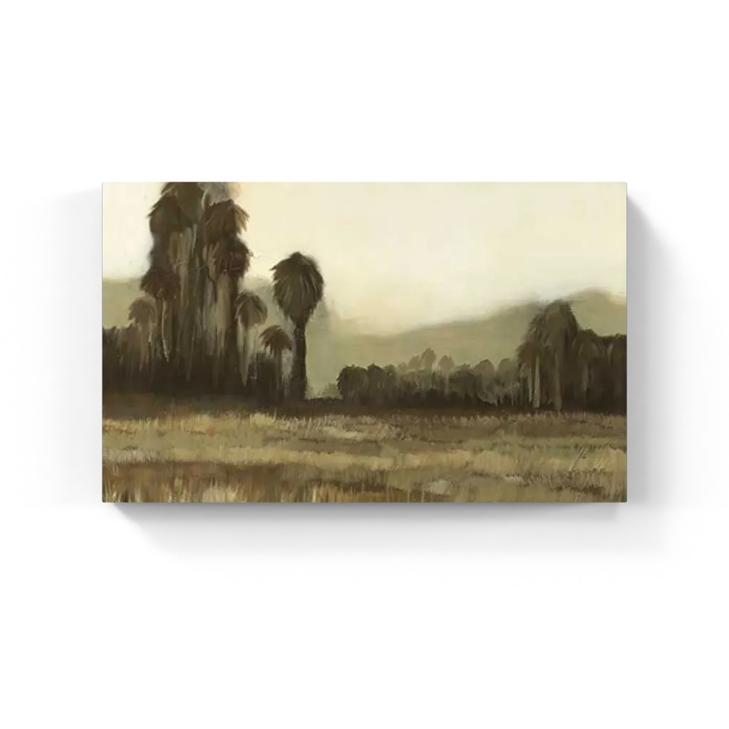 A serene and muted landscape depicting misty hills and silhouetted trees in soft earthy tones. This painting evokes calm and tranquility with its subtle gradient of browns and greens, creating a peaceful atmosphere.