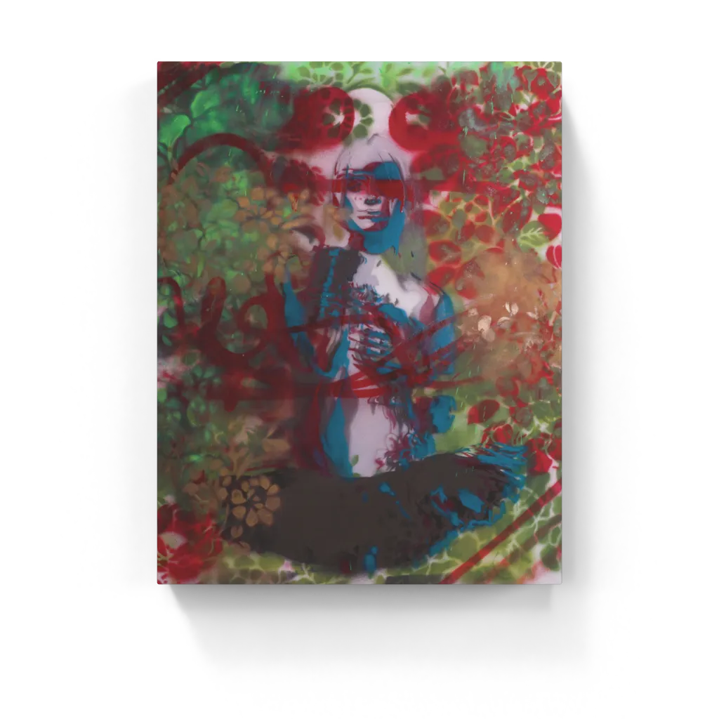 A fractured ballerina cloaked in spectral reds and cyan shadows stares through a jungle of florals and static. Her form is glitch and grace—punk elegance smeared across a dream in spray paint.