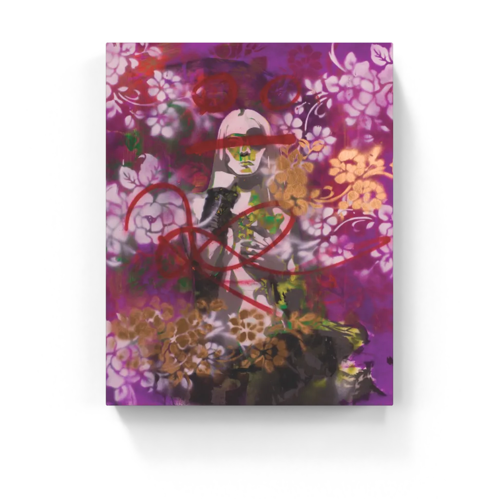 Bathed in ultraviolet and gold, a defiant figure emerges—half-goddess, half-graffiti. Red loops slash across a gaze unseen, while baroque florals pulse behind her like a glitching wallpaper of rebellion.