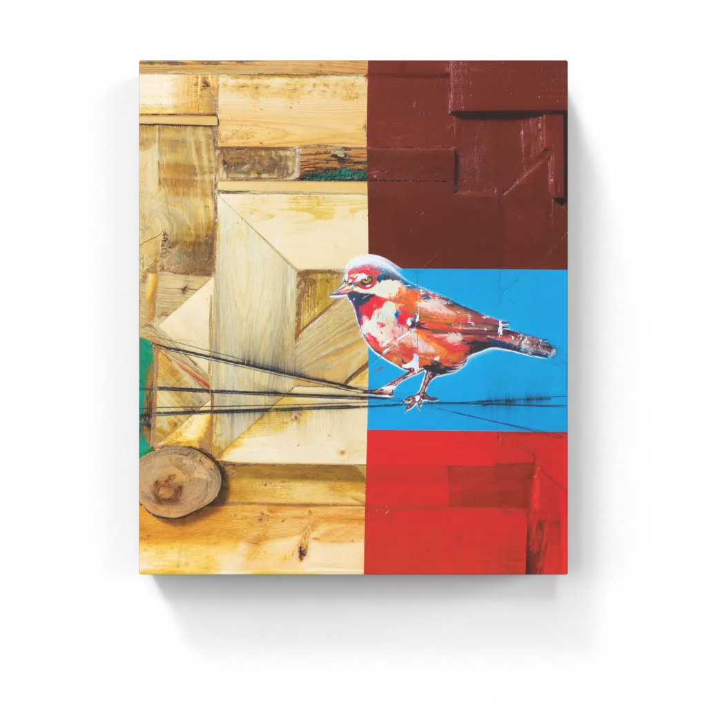 Bird on a Wire I is a vibrant combo of color and texture. Woodgrain geometry, electric hues, and a perched bird painted still. This vibrant abstract bird art fuses nature with structure, capturing the wild wired into modernity. Bold, layered, and contemporary, it radiates both order and an untamed energy.