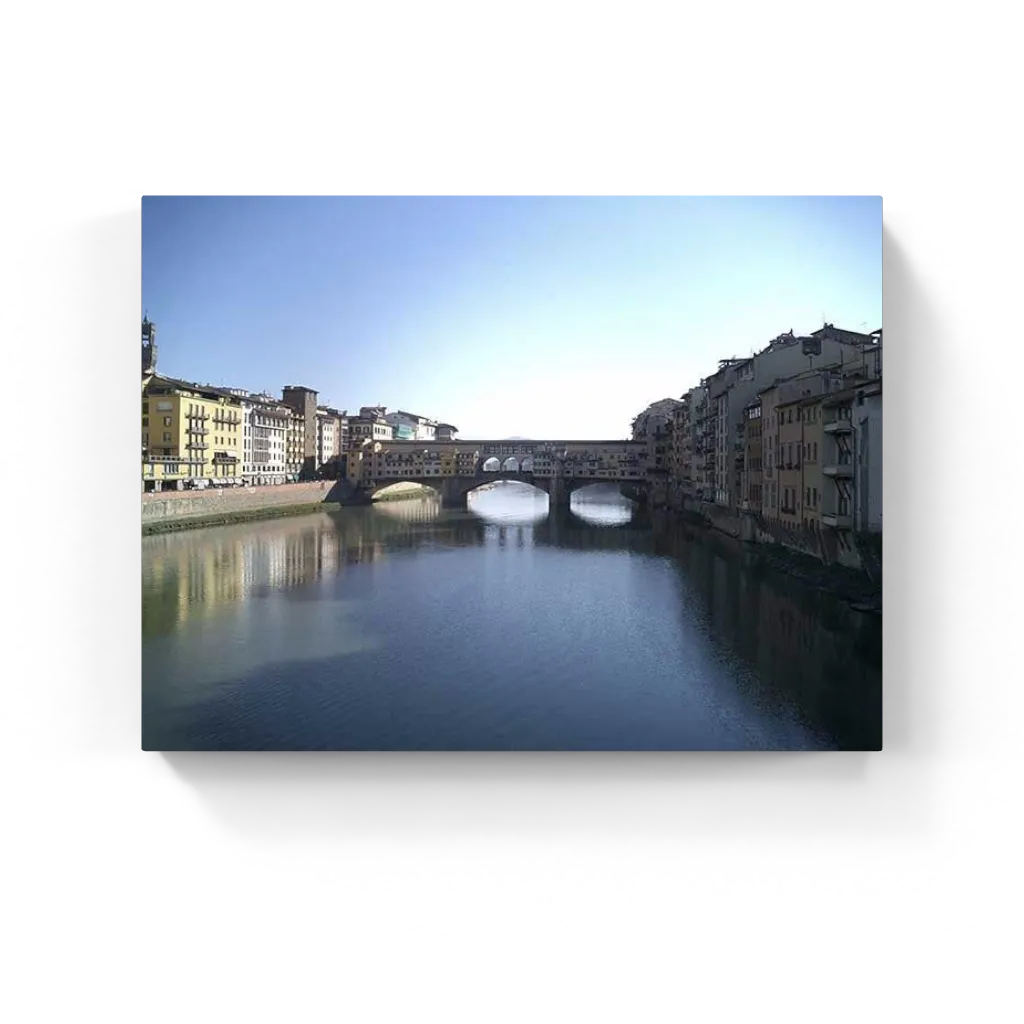 The iconic Ponte Vecchio spans the calm Arno River beneath a clear blue sky, with sunlit facades lining both banks—this classic Florentine view radiates timeless charm and architectural harmony.