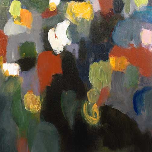 Modified Chronotopes V is an abstract acrylic painting featuring an array of dark and bright patterning featuring neutrals of the greyscale, a variety of greens, yellows, blues, and reds.