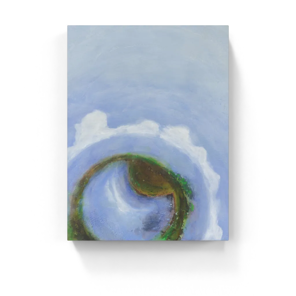 A swirling orb of land and sky curls upward into a misty blue expanse, where horizon meets motion. This earth-inspired abstract painting blends organic shapes and soft gradients, capturing the planet’s rhythm, breath, and emotion.