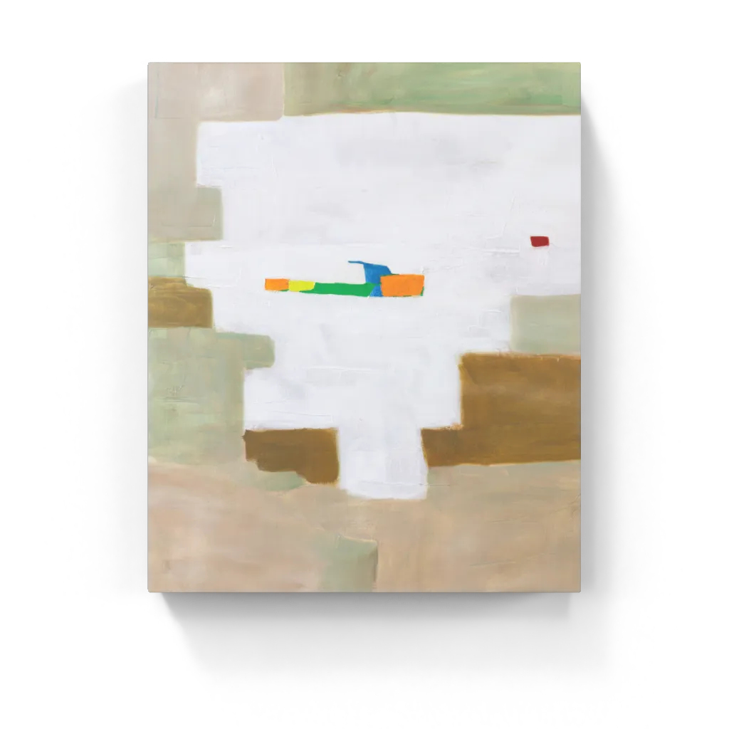 Blocky planes of soft earth tones and pale green suggest sun baked walls and quiet shadows. A burst of orange, blue, and lime cuts across the center like a memory of light. This minimalist abstract painting carries an echo of place and warmth, balancing subtle control with vivid interruption. Contemporary and atmospheric, it radiates calm presence.