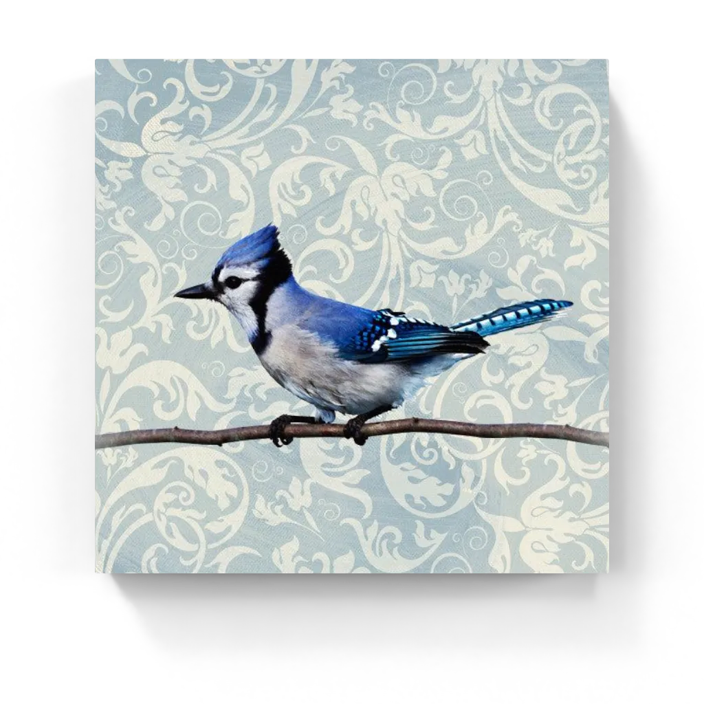Artful depiction of a vibrant blue jay perched elegantly on a branch, set against an ornate, vintage-inspired damask background in soft shades of blue, evoking classical charm.