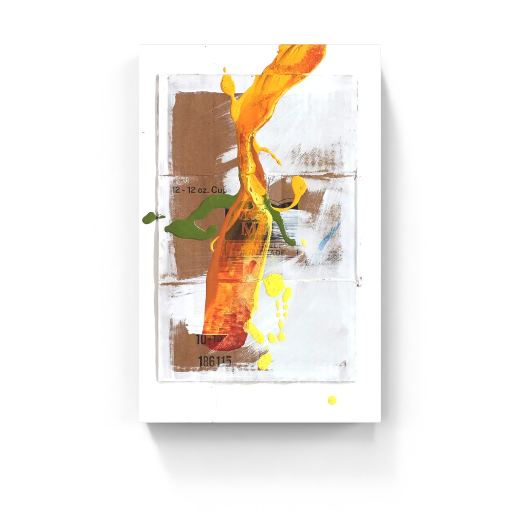 A bold orange and yellow streak erupts vertically across a juice carton, partially veiling the printed label with kinetic drips and energetic brushstrokes. Vivid, visceral, and subversively juicy.